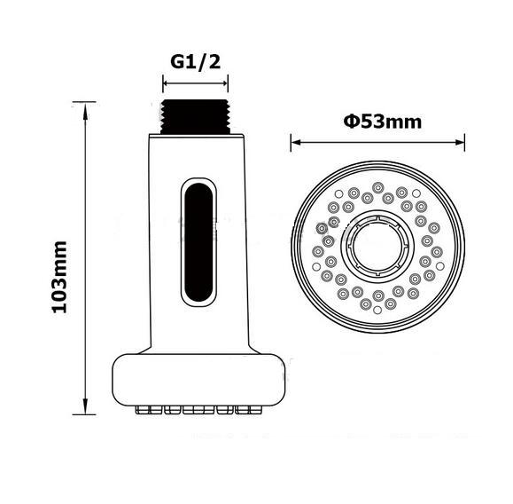 | स्नान नल का मुख्य आयाम | 1) फेस व्यास: 53 * 53 मिमी 2) हाथ बौछार सिर की ऊंचाई: 103 मिमी 3) कनेक्टेड आयाम: जी 1/2 (अंतरराष्ट्रीय आकार, अधिकांश नल के लिए उपयुक्त) |