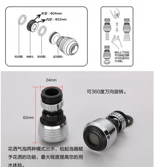| अनुप्रयोगों | 360 घूर्णन एबीएस प्लास्टिक लचीला रसोई के स्नान नल बौछार सिर |